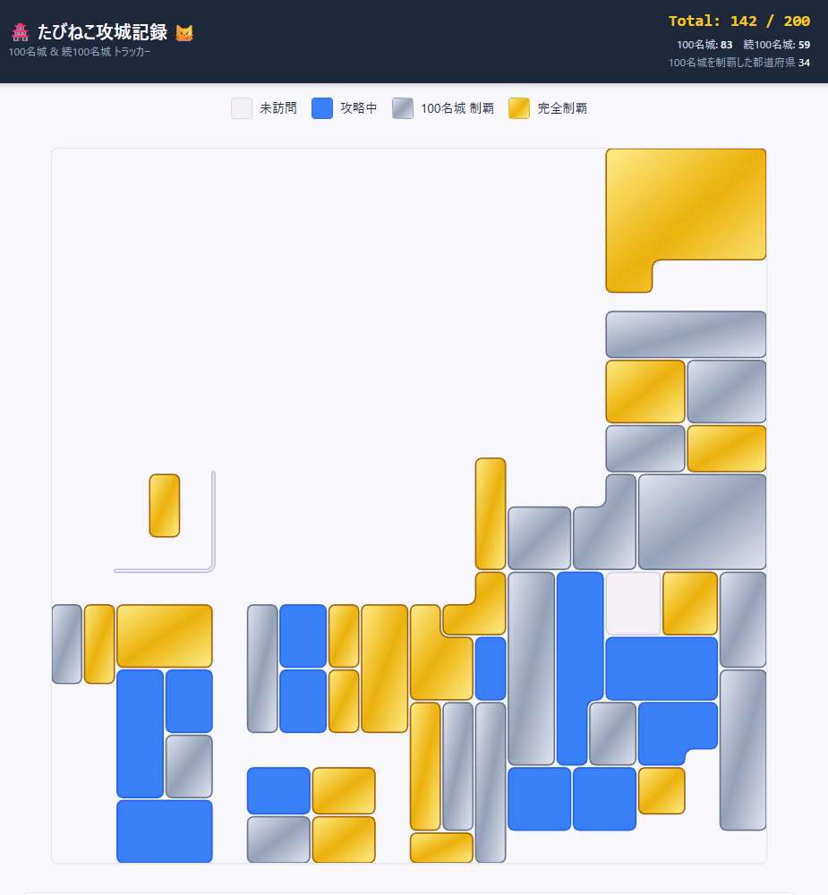 【城好き必見】日本地図を「金色の野望」で塗りつぶせ!「日本100名城・続100名城」進捗状況確認アプリ「🏯 たびねこ攻城記録 😼」を公開しました🏯✨